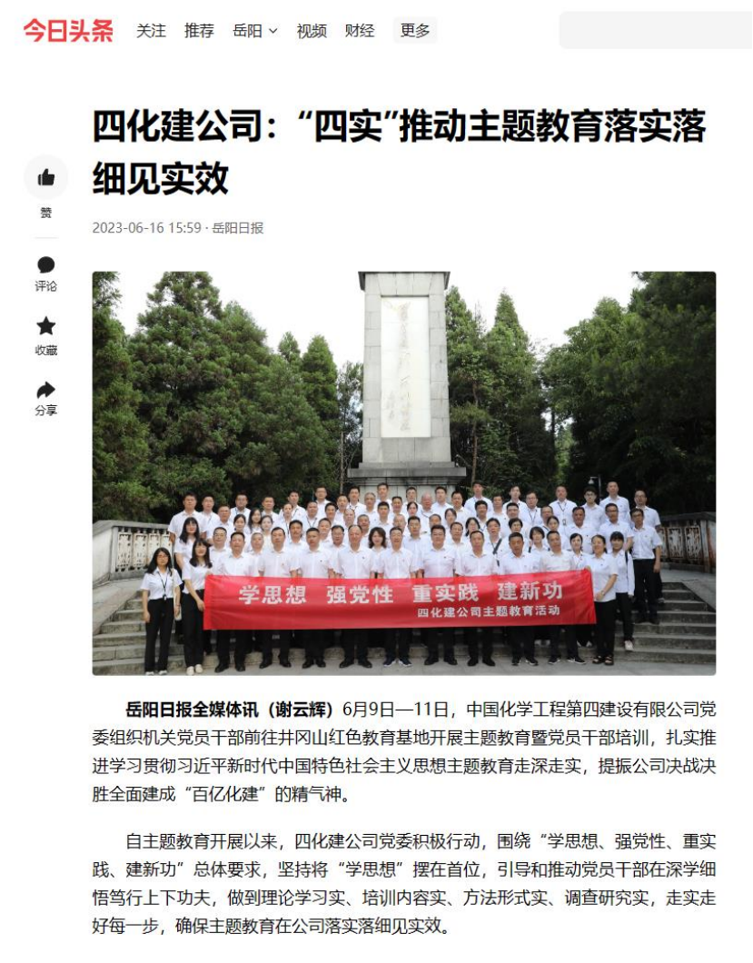 6月19日,《中國化工報》頭版以《四化建公司:“四實”確保主題教育見實效》,對公司扎實開展學(xué)習(xí)貫徹習(xí)近平新時代中國特色社會主義思想主題教育工作進行了全面系統(tǒng)報道,在全國石化行業(yè)引起廣泛影響。在6月16日,今日頭條也對公司主題教育工作進行了系統(tǒng)報道?,F(xiàn)全文轉(zhuǎn)發(fā)如下: