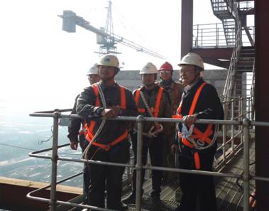 由于此次設(shè)備工程分公司承接的寧夏大地循環(huán)發(fā)展股份有限公司天瑞發(fā)電公司4×480t/h型高溫、高壓、循環(huán)流化床鍋爐安裝工程,為公司首次承接的最大型鍋爐安裝項目,因此倍受公司關(guān)注。14日,胡流芳一行到項目現(xiàn)場后,立即系上安全帶,登上54米高的鍋爐安裝平臺,一層一層的仔細(xì)查看安裝施工細(xì)節(jié),詳細(xì)了解質(zhì)量過程控制措施,認(rèn)真檢查各部位的安全防護(hù)情況。與此同時,張娣玲對項目部工程施工質(zhì)量過程控制資料、安全資料等進(jìn)行了認(rèn)真檢查,并在項目部安全工作例會上對360多名參建員工就施工安全注意事項進(jìn)行了重點強(qiáng)調(diào)。