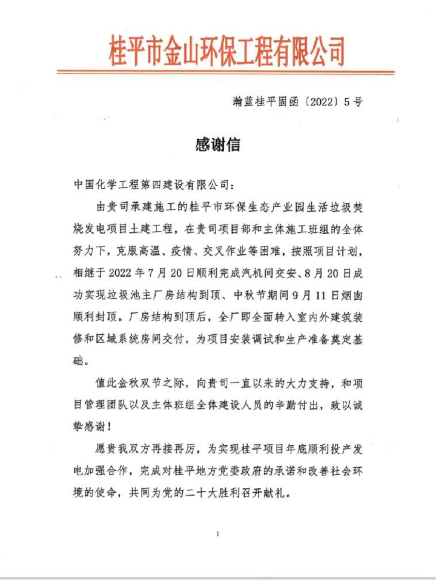 近日,由華南公司承建的桂平垃圾焚燒發電項目收到業主桂平市金山環保工程有限公司的感謝信,感謝公司的大力支持和項目團隊、主體班組全體建設人員的辛勤付出。