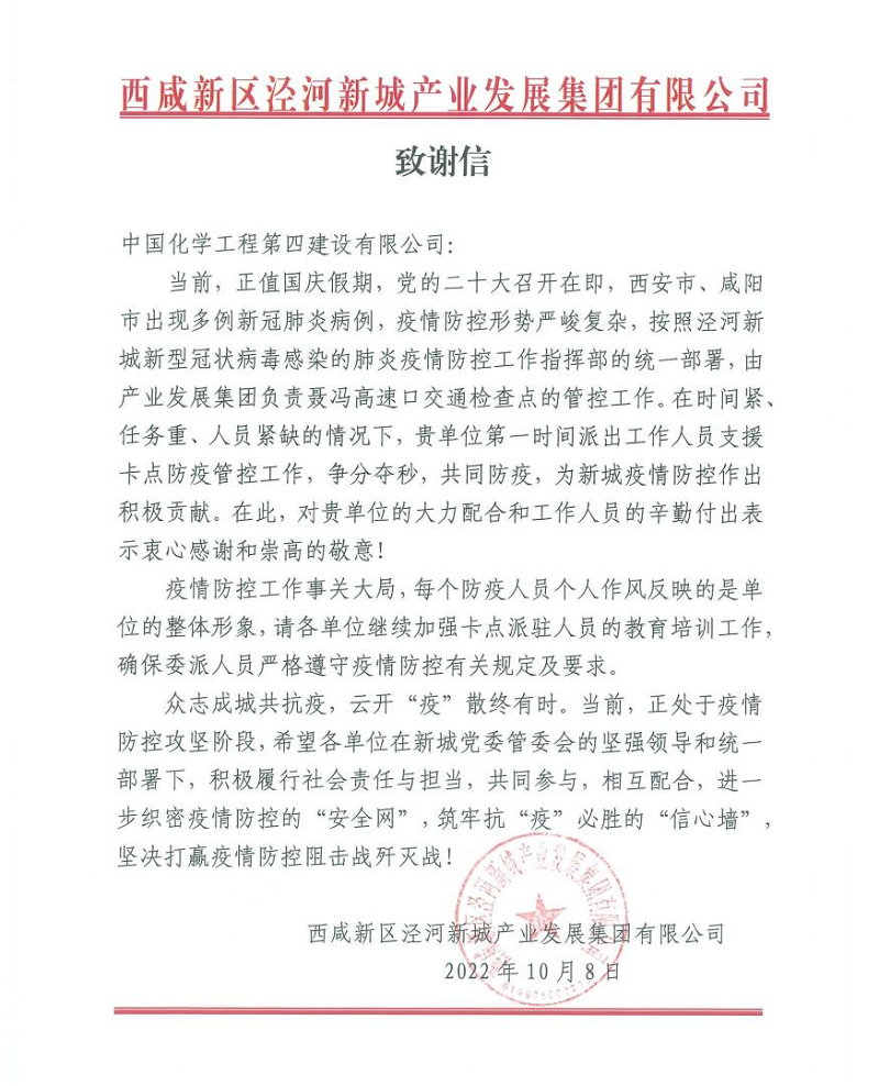 10月9日,陜西西咸新區(qū)涇河新城產(chǎn)業(yè)發(fā)展集團(tuán)有限公司向公司發(fā)來了致謝信,信中對(duì)西部公司泊灣中心項(xiàng)目部在國(guó)慶假期、二十大召開前夕抽調(diào)人員支援西安市聶馮高速口防疫檢查的工作表示衷心感謝,對(duì)公司以實(shí)際行動(dòng)助力屬地疫情防控工作給予高度贊揚(yáng)。