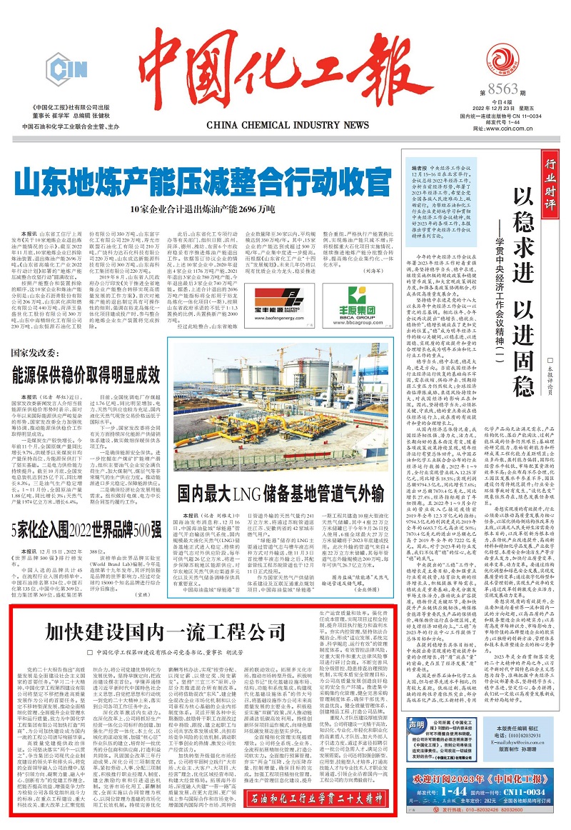 12月23日,《中國化工報》頭版全文刊登公司黨委書記、董事長胡流芳學習貫徹黨的二十大精神體會文章《加快建設國內一流工程公司》,全文如下。