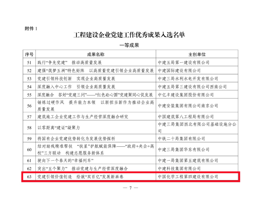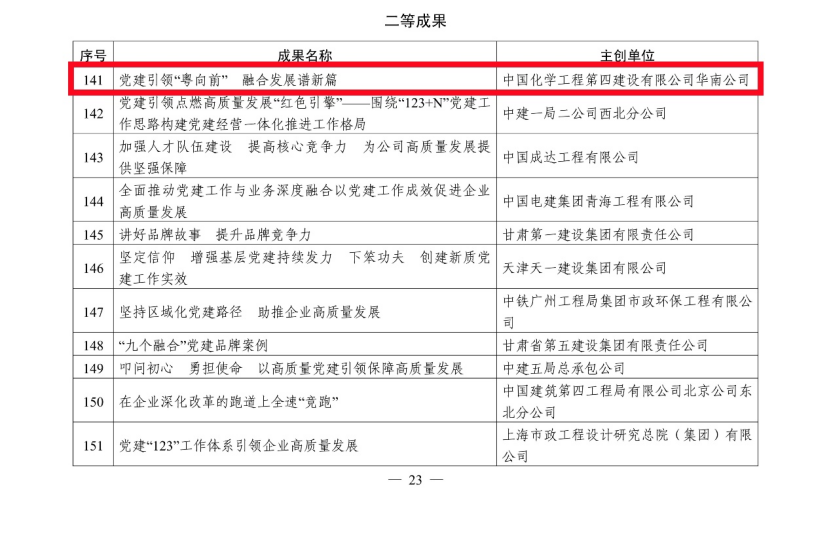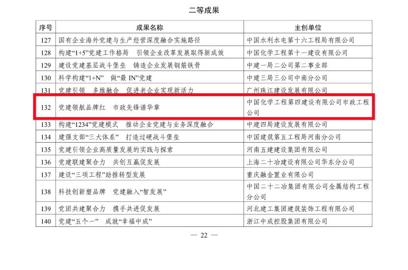 5月27日,從中國(guó)施工企業(yè)管理協(xié)會(huì)傳來(lái)喜訊,公司選送的黨建案例《黨建引領(lǐng)價(jià)值創(chuàng)造 繪就“雙百億”發(fā)展新畫卷》獲評(píng)2024年工程建設(shè)企業(yè)黨建工作一等成果,市政工程公司選送的黨建案例《黨建領(lǐng)航品牌紅 市政先鋒譜華章》和華南公司選送的黨建案例《黨建引領(lǐng)“粵向前” 融合發(fā)展譜新篇》獲評(píng)二等成果。