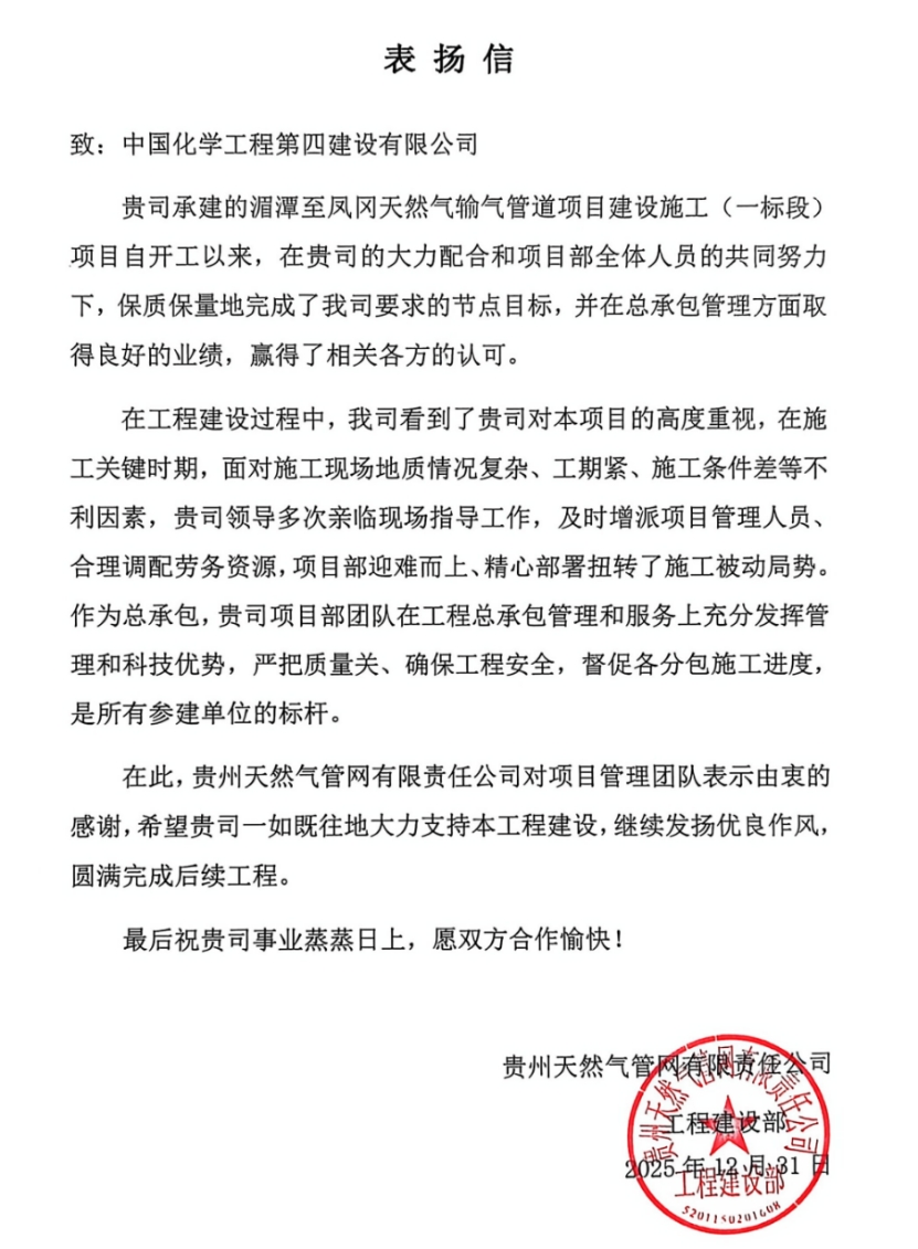 近日,由西部公司承建的湄潭至鳳岡天然氣輸氣管道項(xiàng)目收到貴州天然氣管網(wǎng)有限責(zé)任公司發(fā)來的表?yè)P(yáng)信,對(duì)項(xiàng)目團(tuán)隊(duì)保質(zhì)保量完成節(jié)點(diǎn)目標(biāo)、在總承包管理方面取得的良好業(yè)績(jī)給予高度評(píng)價(jià)。