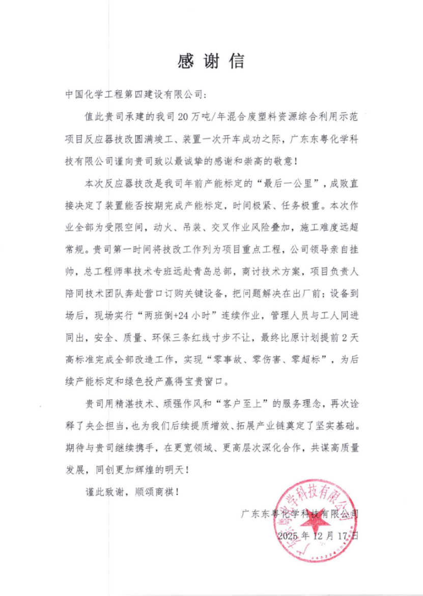 近日,華南公司收到廣東東粵化學(xué)科技有限公司發(fā)來的感謝信,對(duì)華南公司在20萬(wàn)噸/年混合廢塑料資源綜合利用示范項(xiàng)目反應(yīng)器技改工程中的出色表現(xiàn)給予高度評(píng)價(jià),并對(duì)項(xiàng)目團(tuán)隊(duì)展現(xiàn)出的專業(yè)水準(zhǔn)、過硬作風(fēng)與“客戶至上”的服務(wù)理念表示誠(chéng)摯感謝。
