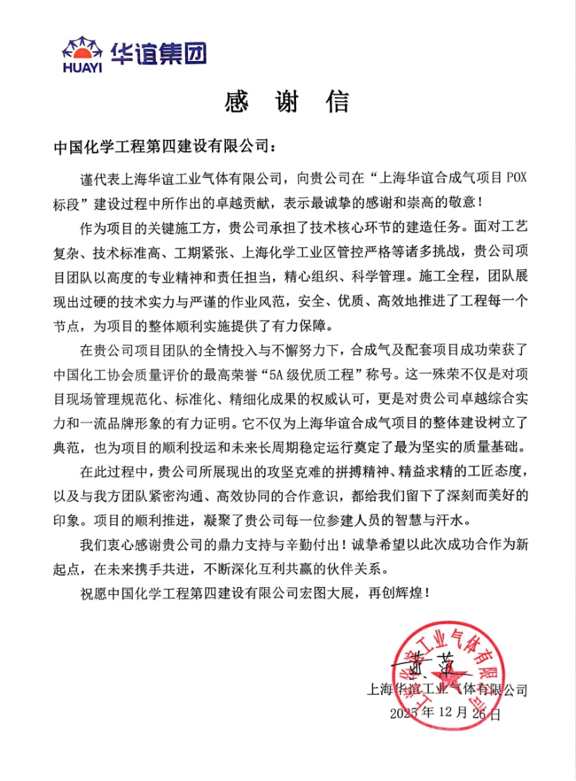 近日,華東公司收到上海華誼工業(yè)氣體有限公司發(fā)來的感謝信,對(duì)華東公司在上海華誼合成氣供應(yīng)及配套項(xiàng)目POX標(biāo)段建設(shè)過程中的專業(yè)表現(xiàn)與突出貢獻(xiàn)給予高度評(píng)價(jià)。