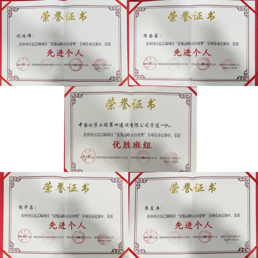 近日,在中沙古雷乙烯項(xiàng)目引領(lǐng)性勞動(dòng)競賽2025年度總結(jié)暨創(chuàng)新成果交流活動(dòng)中,中國化學(xué)工程第四建設(shè)有限公司華南公司中沙古雷項(xiàng)目部管道一隊(duì)榮獲“優(yōu)勝班組”稱號,黃國蕓、賴華昌、廖良兵、閆鴻偉等4名員工榮獲“先進(jìn)個(gè)人”稱號。
