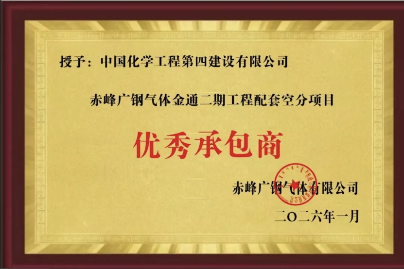 近日,中國化學工程第四建設有限公司華南公司憑借在廣鋼氣體金通二期工程配套空分項目機電安裝工程中的優異表現,被赤峰廣鋼氣體有限公司授予“優秀承包商”稱號。