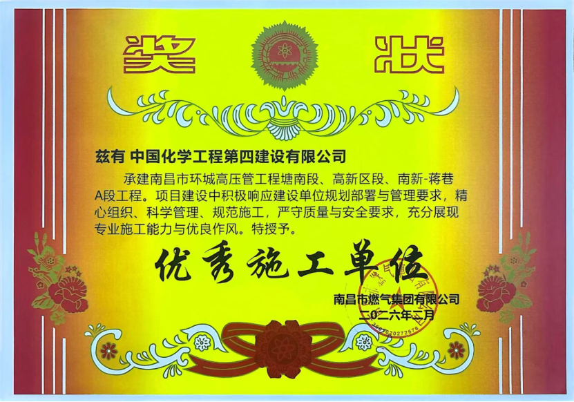 近日,由華北公司承建的南昌市環(huán)城高壓管工程塘南段、高新區(qū)段、南新-蔣巷A段等三個標段,被南昌市燃氣集團有限公司授予“優(yōu)秀施工單位”榮譽稱號。