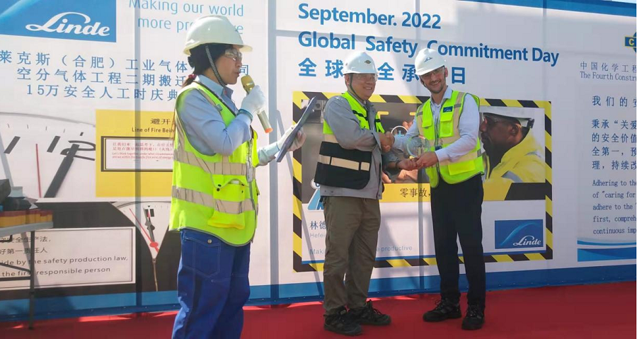 9月19日下午,華東公司普萊克斯(合肥)工業(yè)氣體有限公司空分氣體工程二期搬遷項(xiàng)目在現(xiàn)場(chǎng)舉行15萬(wàn)安全工時(shí)慶典。業(yè)主林德亞太區(qū)總監(jiān)羅伯特出席慶典。