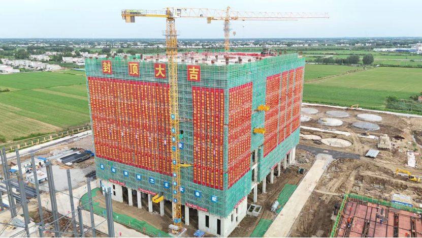 該聚合廠房主體7層局部9層,建筑高度65.7米,框架剪力墻結構,占地面積4085.64㎡,建筑面積30693.09㎡。自2024年12月12日基礎動土開挖以來,項目部采用標準化作業與先進工藝技術,克服高支模危大工程等施工難點,以“11.5天/層”的施工速度推進建設,最終提前4天完成封頂任務,刷新同類化工廠房建設效率紀錄,獲業主方高度認可。