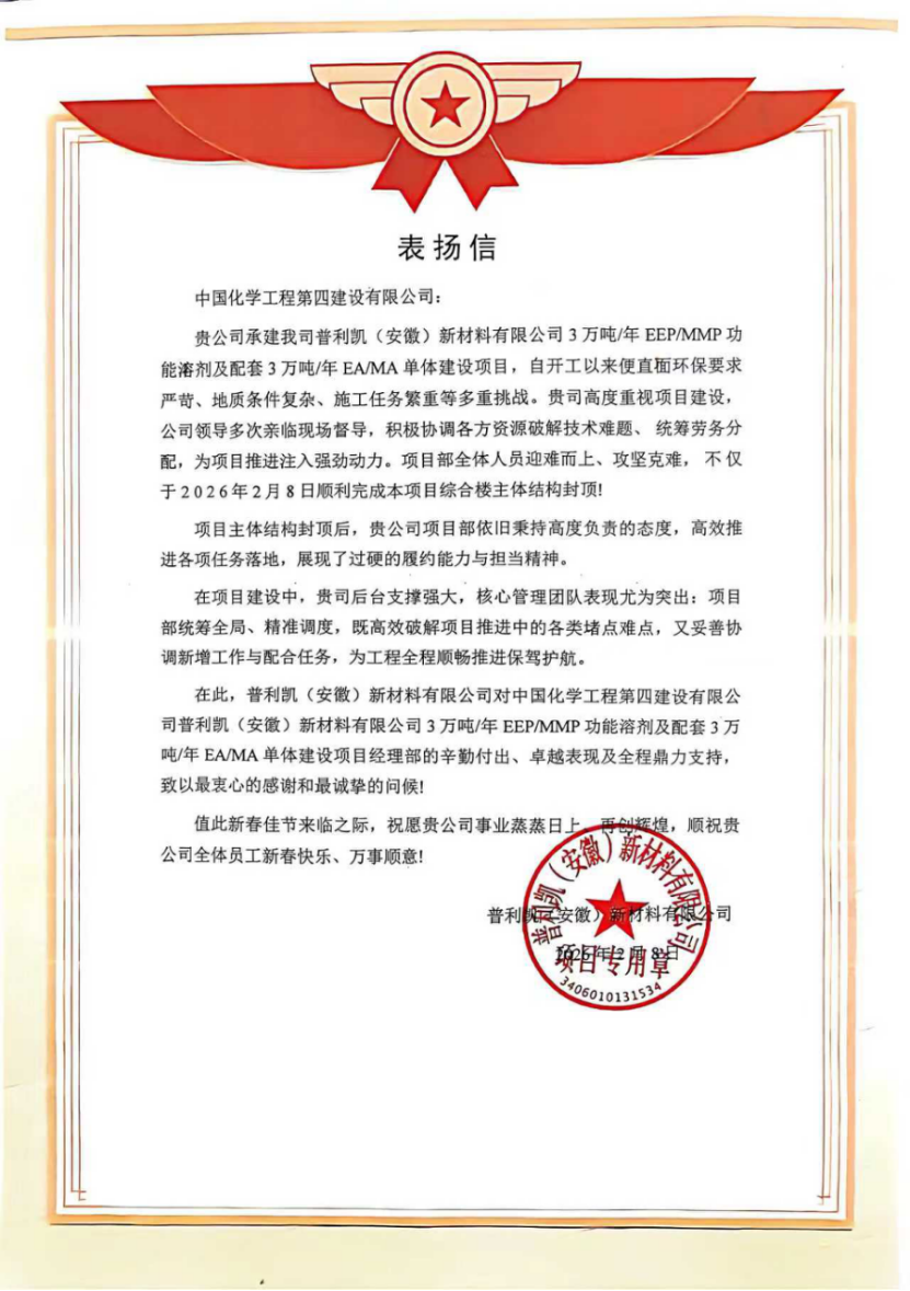 近日,由西部公司承建的普利凱(安徽)新材料有限公司3萬噸/年EEP/MMP功能溶劑及配套3萬噸/年EA/MA單體建設(shè)項(xiàng)目綜合樓主體結(jié)構(gòu)順利封頂,標(biāo)志著項(xiàng)目建設(shè)取得階段性勝利,正式轉(zhuǎn)入二次結(jié)構(gòu)及裝飾裝修施工階段。業(yè)主單位特發(fā)來表?yè)P(yáng)信,對(duì)項(xiàng)目團(tuán)隊(duì)的卓越表現(xiàn)給予高度評(píng)價(jià)。