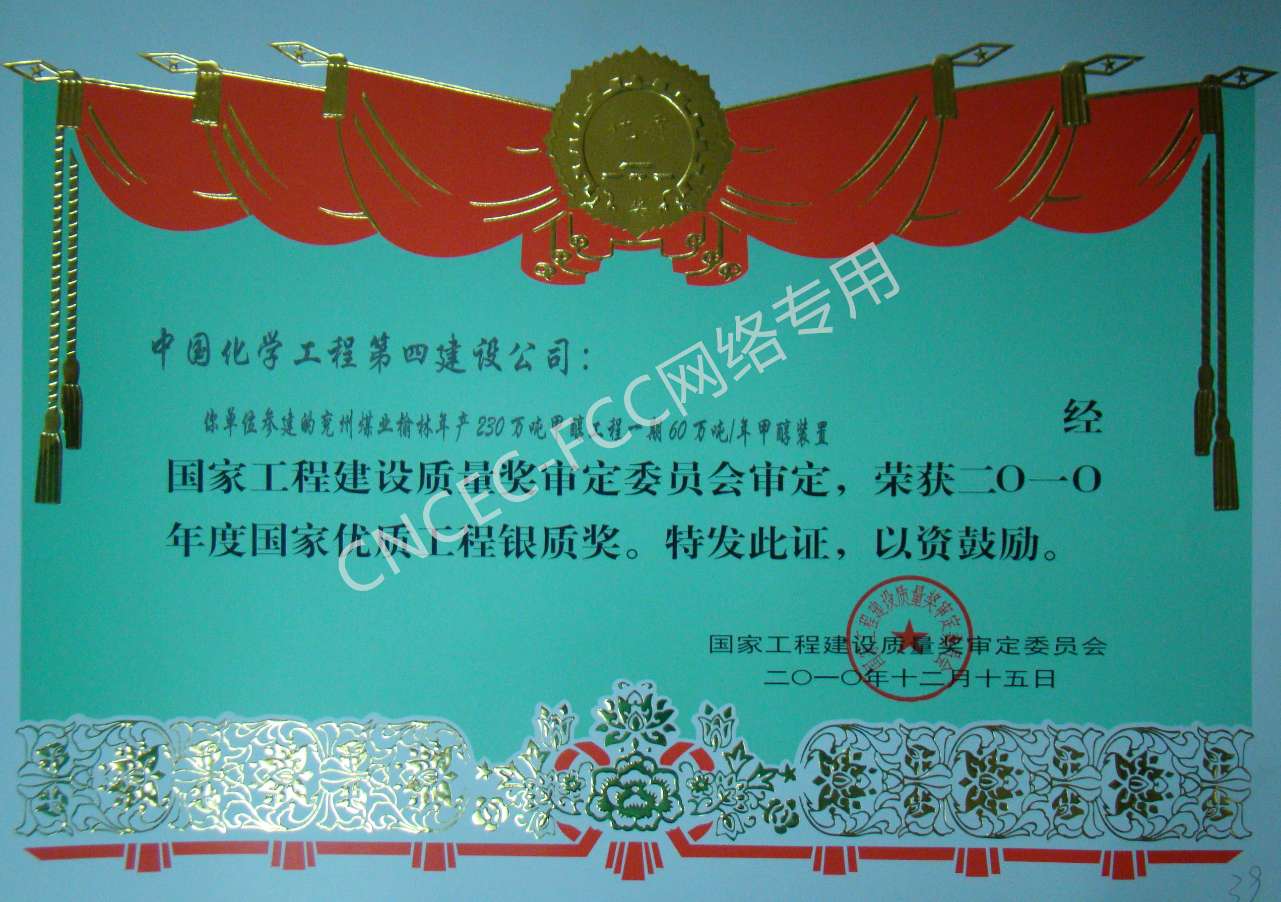 兗州煤業榆林年產230萬噸甲醇工程一期60萬噸年甲醇裝置國家優質工程銀質獎